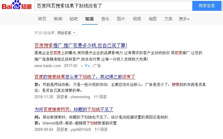 你注意到了沒有?今天看百度搜索結(jié)果有點怪怪的,仔細一下,原來是百度網(wǎng)頁搜索結(jié)果去掉標題下劃線,看了還真有點不習(xí)慣。不過除了網(wǎng)頁搜索結(jié)果外,其他欄目的搜索結(jié)果標題下劃線還在。
