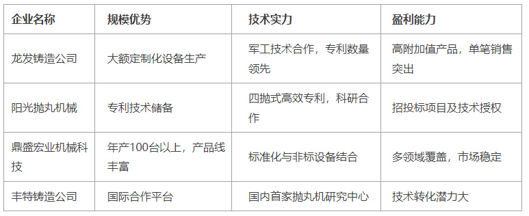 技術實力最強:陽光拋丸機械(專利數量)和龍發(fā)鑄造公司(軍工合作研發(fā))技術領先。