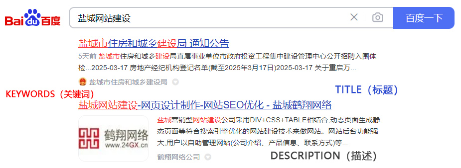 1-較大的一行字是Title(標(biāo)題) 2-較小的文字是Description(描述) 3-紅色字是搜索Keywords(關(guān)鍵詞)